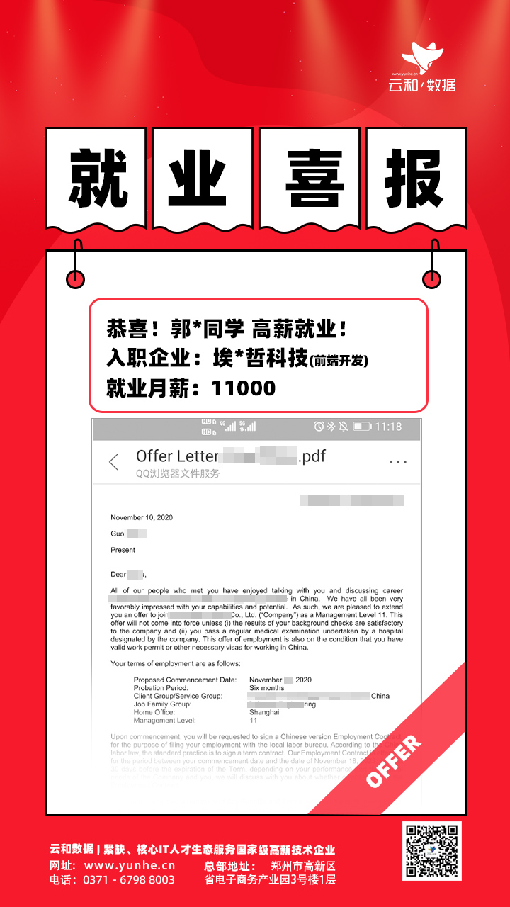 恭喜云和数据郭同学高薪就业!月薪11K!岗位前端开发工程师!