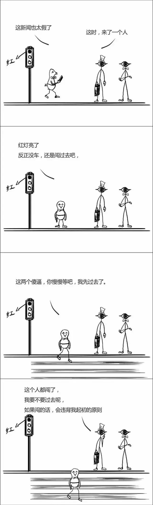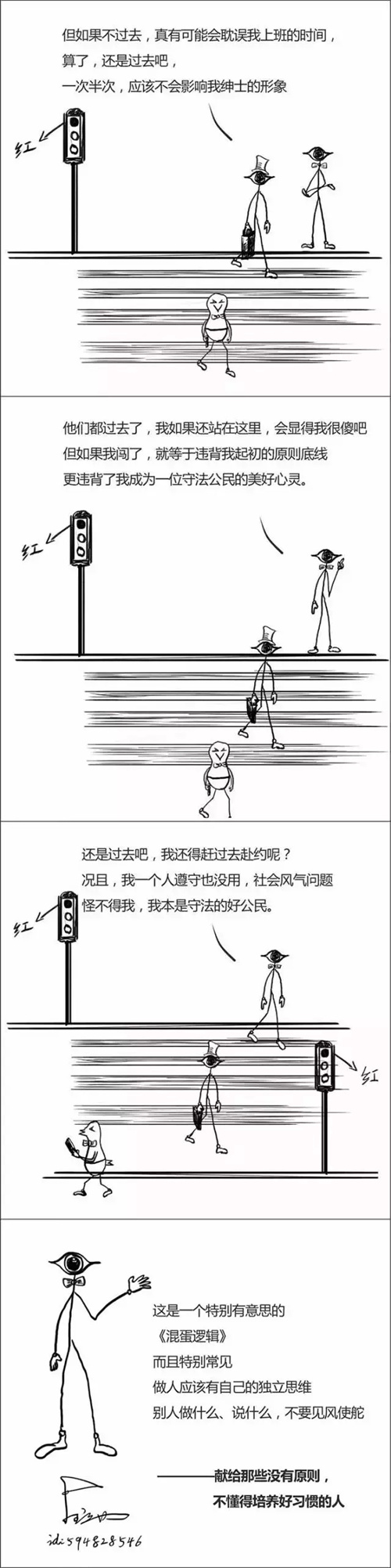 以上漫画摘自最近爆火的《混蛋逻辑》,这种行为逻辑在生活中却十分常见,表现为没有或不敢坚持自己的主见,容易受到别人和外界的影响,随波逐流。